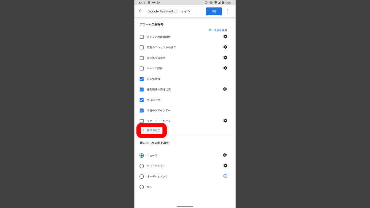 さらに今回の「Google」v10.61.16.21 アップデートにおける “ルーティーン” ページの刷新では、“アラーム” の “ルーティーン” ページも刷新されています。そしてこの “アラーム” の “ルーティーン” ページは見た目が刷新されただけでなく、新たに “操作の追加” が追加され、よりカスタマイズが可能となりました。