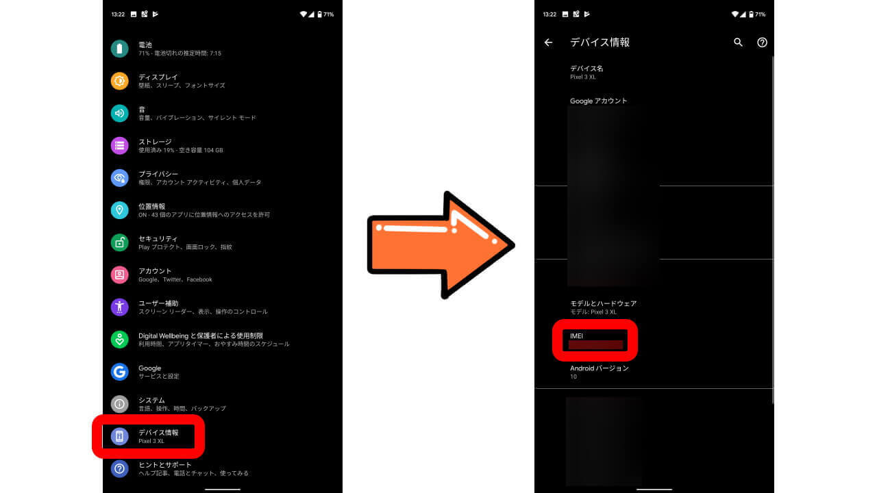 また問い合わせを進めていく課程で、15 桁の端末番号(IMEI)を Google に教える必要があるので、先に調べてメモを取っておきましょう。端末番号は、Android 設定の “デバイス情報” から確認することができます。