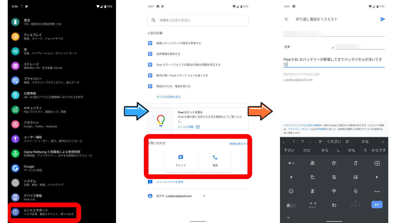お電話にてお伝えさせていただきましたが、Pixel 3 XL の膨張した箇所のお写真をこのメールに添付して返信していただけますと幸いです。