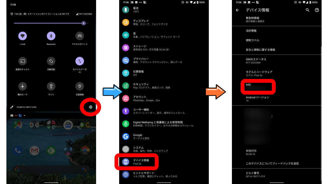 まず歯車アイコンをタッチして Android 設定を開き、[デバイス情報]をタッチします。表示される[デバイス情報]ページの[IMEI]部分がそれです。