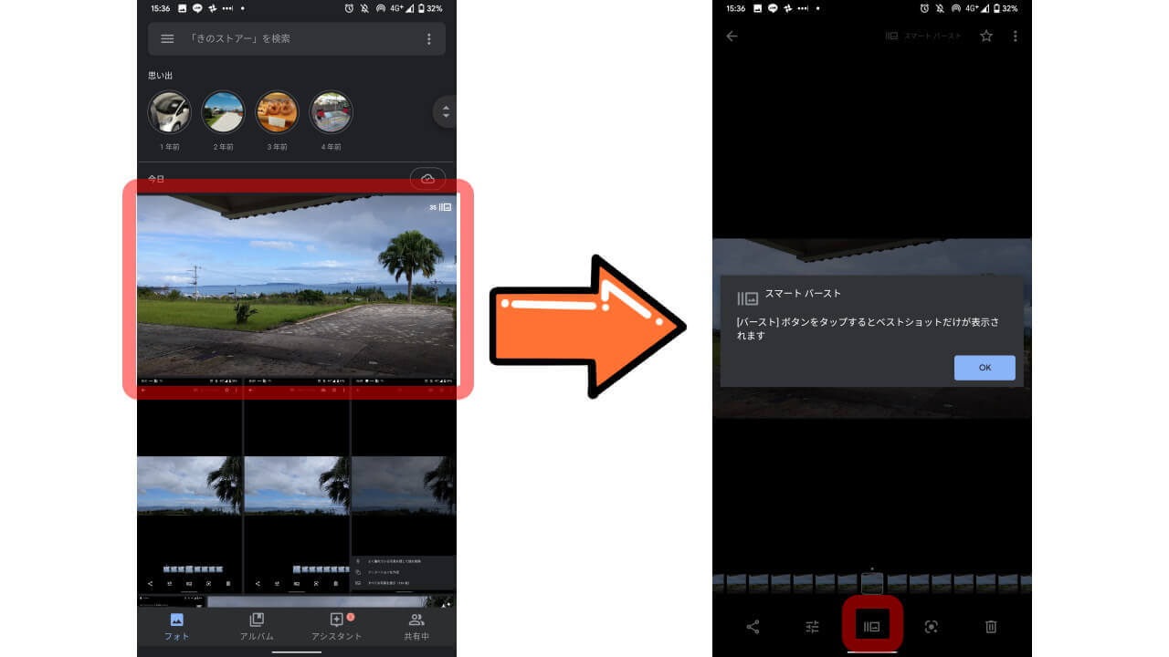 「Google カメラ」の “バースト撮影” で撮った写真は、「Google フォト」にて 1 グループで保存されます。
