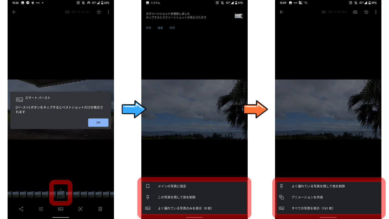 このほか[スマートバースト]ではベストショットのみを残して他の写真を削除したり、8 枚のよく撮れている写真を残して他の写真を削除する機能なども利用可能です。