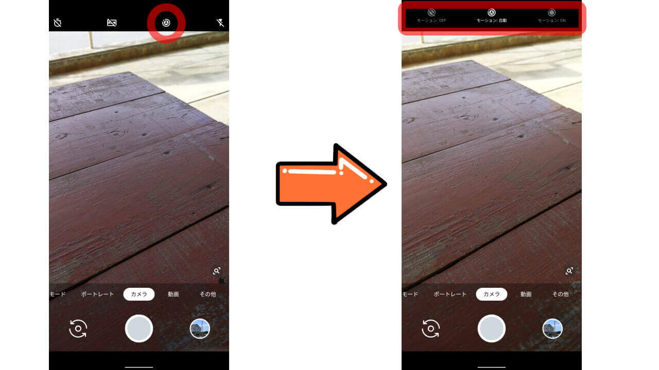 「Google カメラ」アプリを起動して、画面上部のメニュバー部分にある[A]部分をタッチします。選択できる項目は、[モーション:OFF][モーション:自動][モーション:ON]の 3 つです。