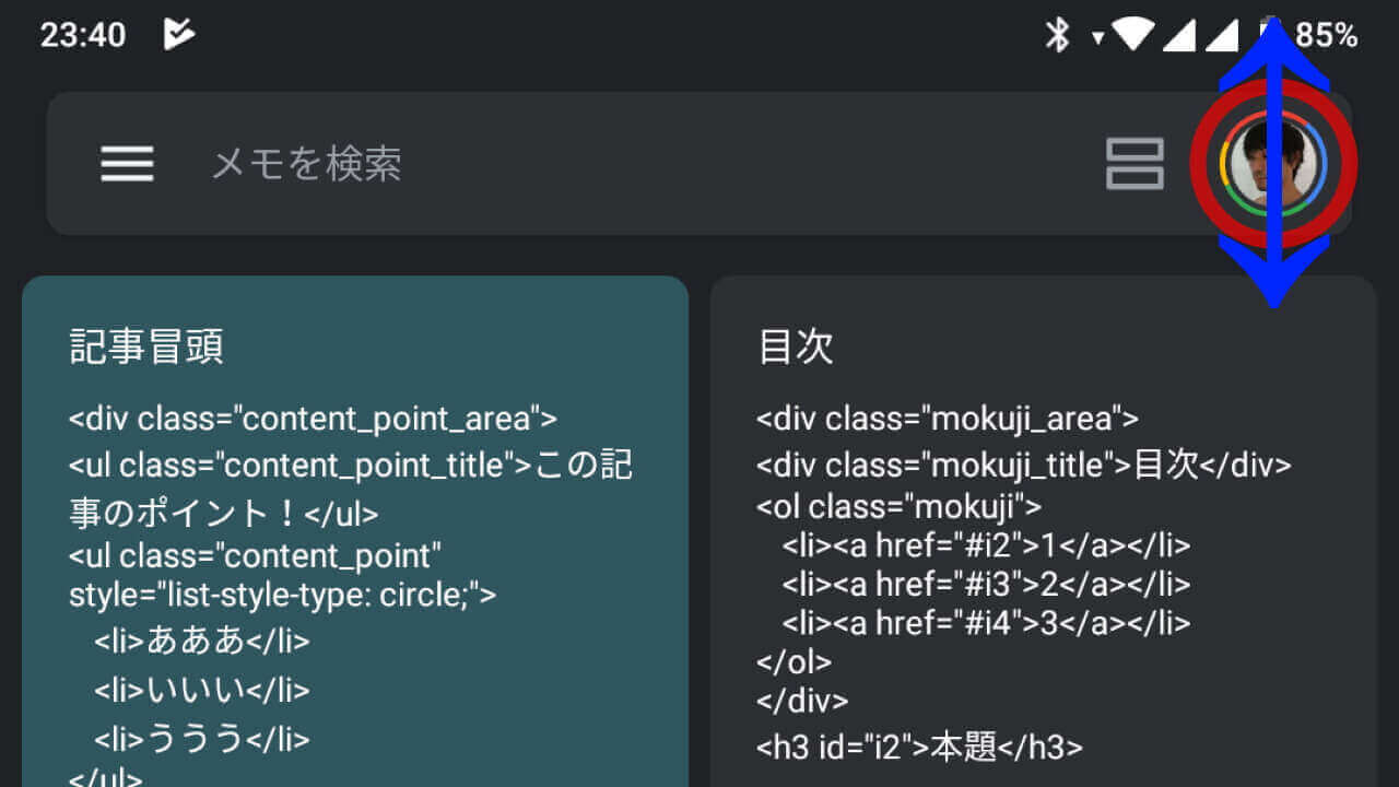 Android 版「Google Keep」アプリのアカウントクイック切り替えは、「Google マップ」「Gmail」「Google ドライブ」「連絡帳(Android)」などと同じく、ホーム画面右上のアカウントアイコンを上か下にスワイプするだけです。Android に複数の Google アカウントを設定している場合に、即座にアカウントを切り替えることができます。