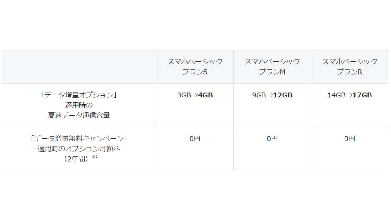 当初、ワイモバイルの新料金プラン「スマホベーシックプラン S / M / R」は、「データ増量キャンペーン」有りで発表されていたのですが、恐らく「UQ mobile」の新料金プランで廃止された、ワイモバイルの「データ増量オプション」と同等のサービス「増量オプション」に合わせて、ワイモバイルでも「データ増量オプション」をなくしつつ、ベースとなるデータ容量を増量したものと予想されます。