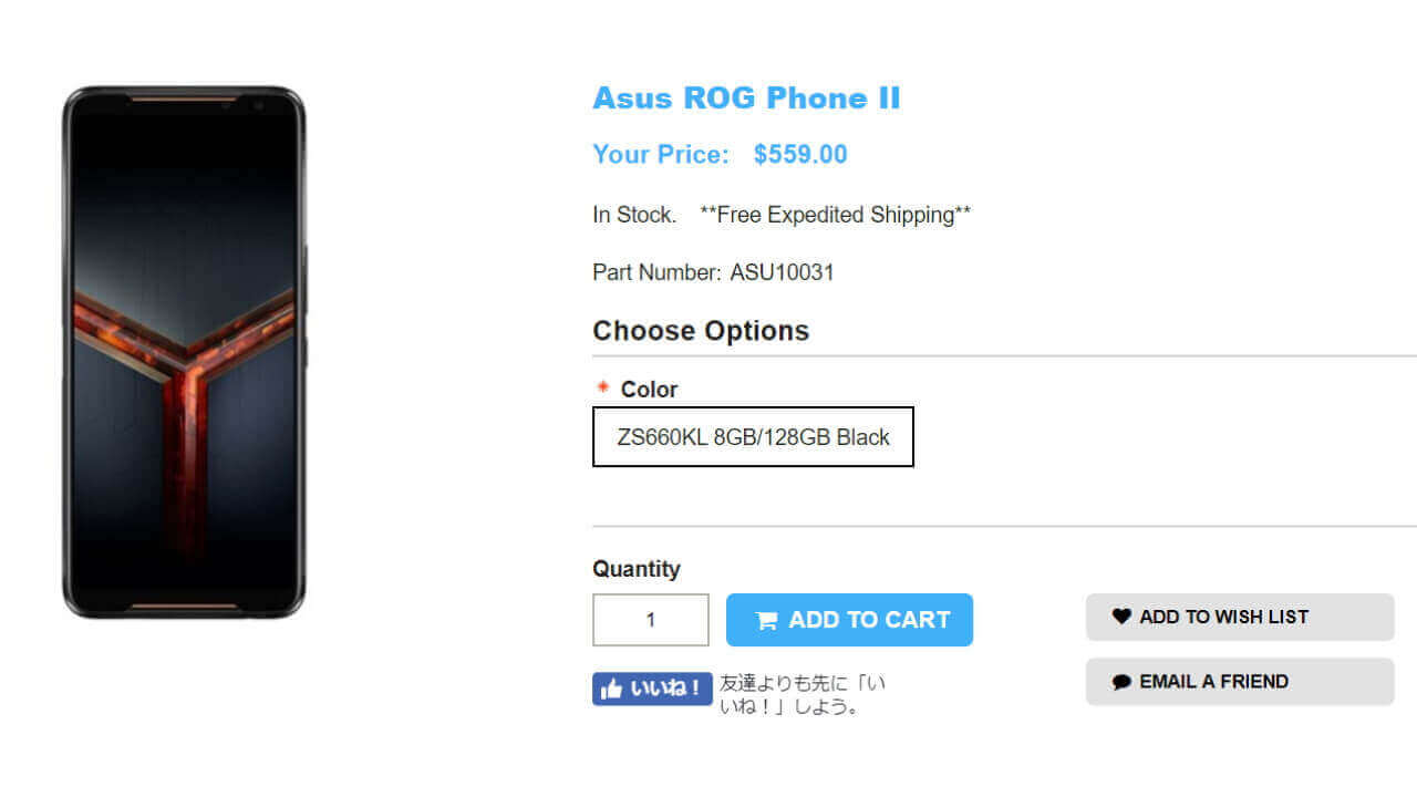 1ShopMobile における「ROG Phone II」の価格は、国際送料込 $559.00(約 60,500 円)です。目を疑ってしまうほどの安さとなっていますが、今回入荷したモデルは、7 月に発表されていた 12GB RAM 搭載モデルではなく、その下位モデルの 8GB RAM 搭載モデルとなります。それでも安いですけどね。