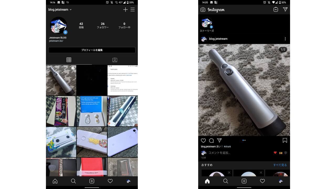 それにしても、明るいイメージのある「Instagram」アプリですが、ダークモードのブラック基調はとても新鮮です。