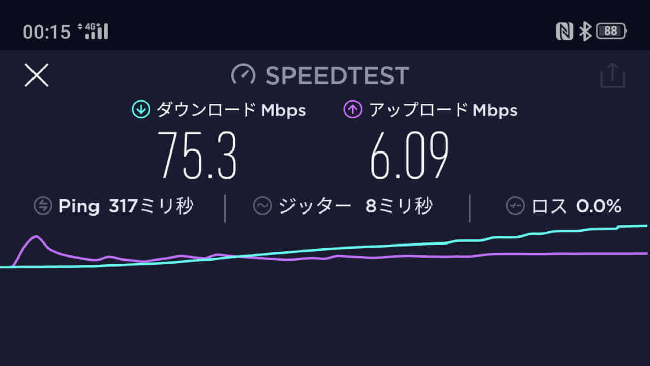 一応記念にスピードテスト。下り 75.3Mbps はなかなかですね。ただ「Google Fi」、上りが結構遅い印象です。
