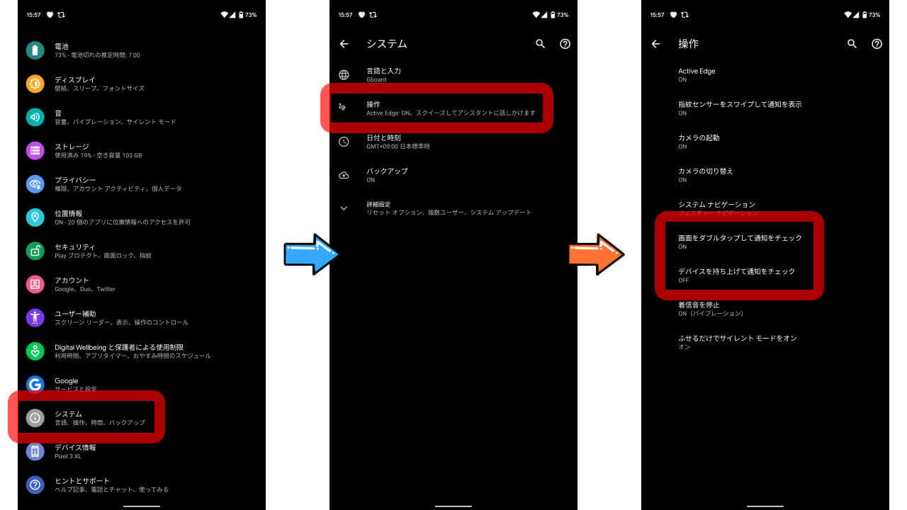 Android 設定を開いて、[システム]→[操作]とタッチして進みます。表示される[操作]ページの、[画面をタブルタップして通知をチェック]と[デバイスを持ち上げて通知をチェック]がそれぞれの設定項目です。