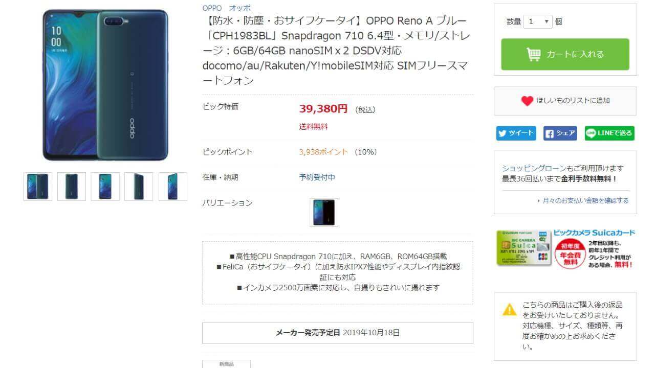 「Reno A」64GB モデルの発売予定日は、10 月 18 日です。ビックカメラにおける価格は税込み 39,380 円ですが、さらに 10% ポイント(3,938pt)還元付きと、Amazon よりもお得です。
