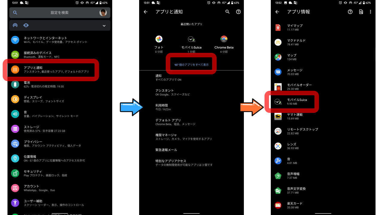Android 版の「モバイル Suica」アプリで、“モバイルSuica起動中” の通知が消えない場合の対処法は、まず Android 設定を開いて[アプリと通知]をタッチし、[アプリをすべて表示]などから[モバイル Suica]を探してタッチします。