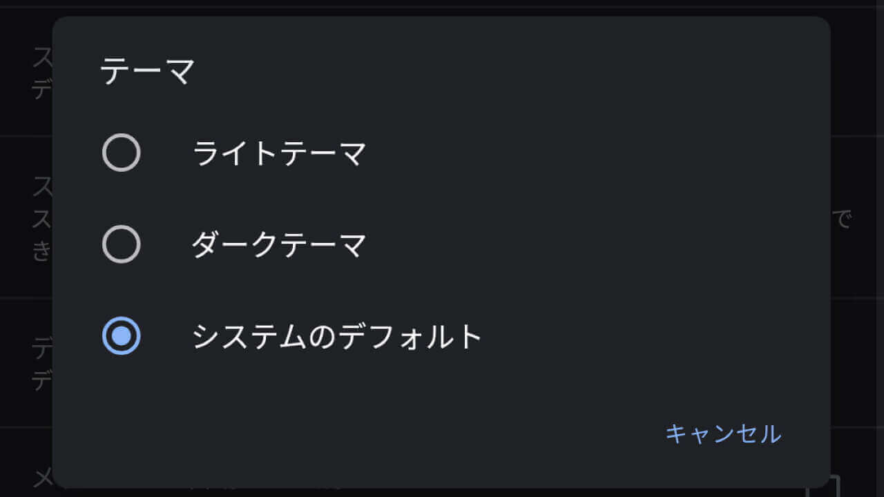 この[テーマ]から、ダークモードとライトモードの切り替えが可能。実際には、[ライトテーマ][ダークテーマ][システムのデフォルト]から選択可能です。