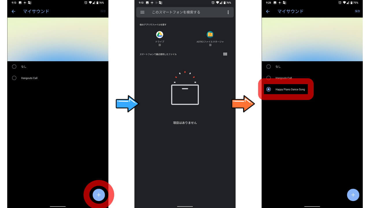 オリジナル着信音の追加方法は、まず端末のローカルフォルダや「Google ドライブ」に着信音として設定したい楽曲ファイルをダウンロードしておき、「サウンド」アプリの[マイサウンド]内にある[+]アイコンをタッチして、ダウンロードした楽曲ファイルを選択して追加します。あとは、追加した楽曲を着信音に設定するのみです。
