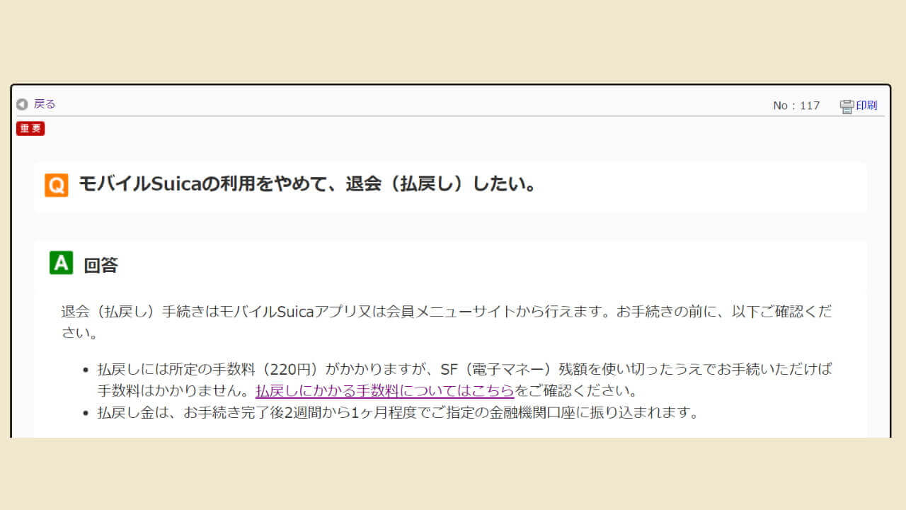 退会(払戻し)手続きはモバイル Suica アプリ又は会員メニューサイトから行えます。お手続きの前に、以下ご確認ください。払戻しには所定の手数料(220円)がかかりますが、SF(電子マネー)残額を使い切ったうえでお手続いただけば手数料はかかりません。