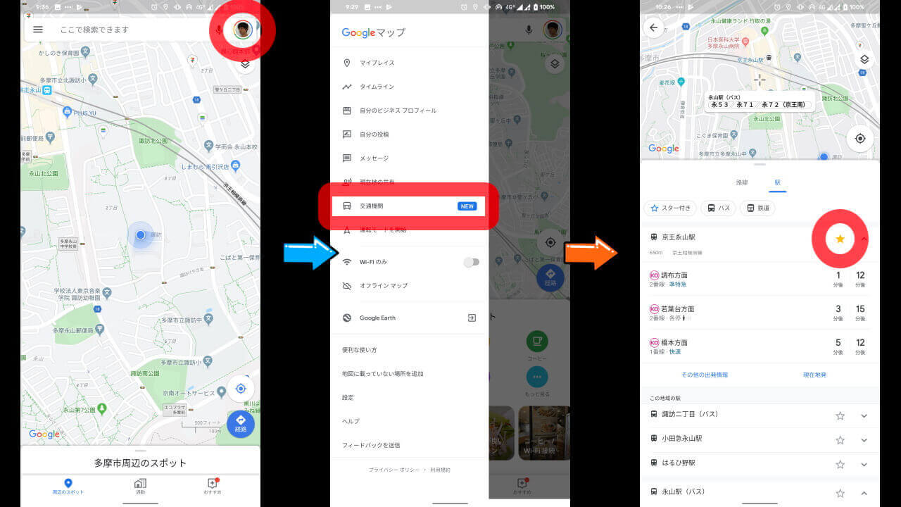 この「Google マップ」アプリに追加された新機能の[交通機関]は、よく利用する電車やバスの駅をフォローして、素早く直近の時刻表を確認することができる便利機能です。利用法は簡単で、「Google マップ」アプリのメニューから[交通機関]をタッチし、フォローする駅の[☆]マークをタッチして上部に表示させるようにします。