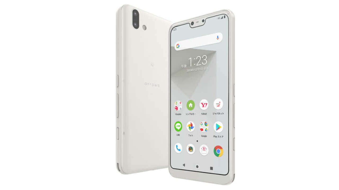 「arrows J(FMWAH1)」は、ノッチ仕様の 5.84 インチ(2,280 × 1,080)フル HD+ ディスプレイ、Snapdragon 450 プロセッサ、3GB RAM、32GB 内部ストレージを搭載するミドルスペックスマートフォンです。