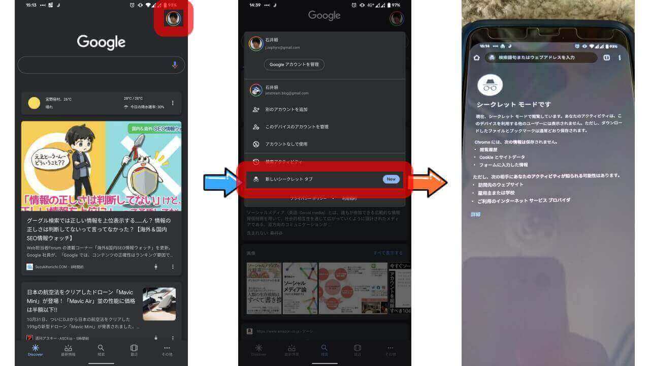 Android 版「Google」アプリのシークレットモードは、[新しいシークレット タブ]として提供されています。利用方法は簡単で、「Discover」タブなどからアカウントアイコン部分をタッチして、[新しいシークレット タブ]をタッチするだけです。