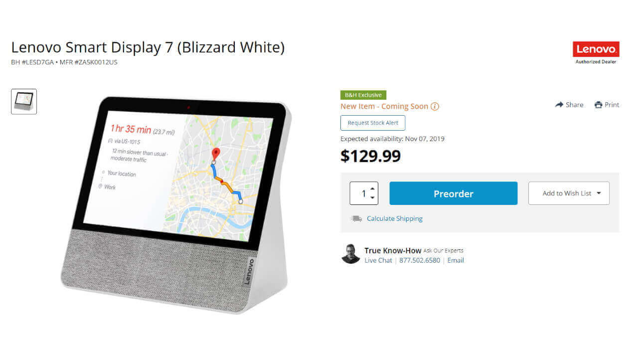 IFA 2019 にて Lenovo より発表された新型 Google スマートディスプレイ「Smart Display 7」が、米国のカメラ & ビデオ量販店 B&H にて予約開始されました。
