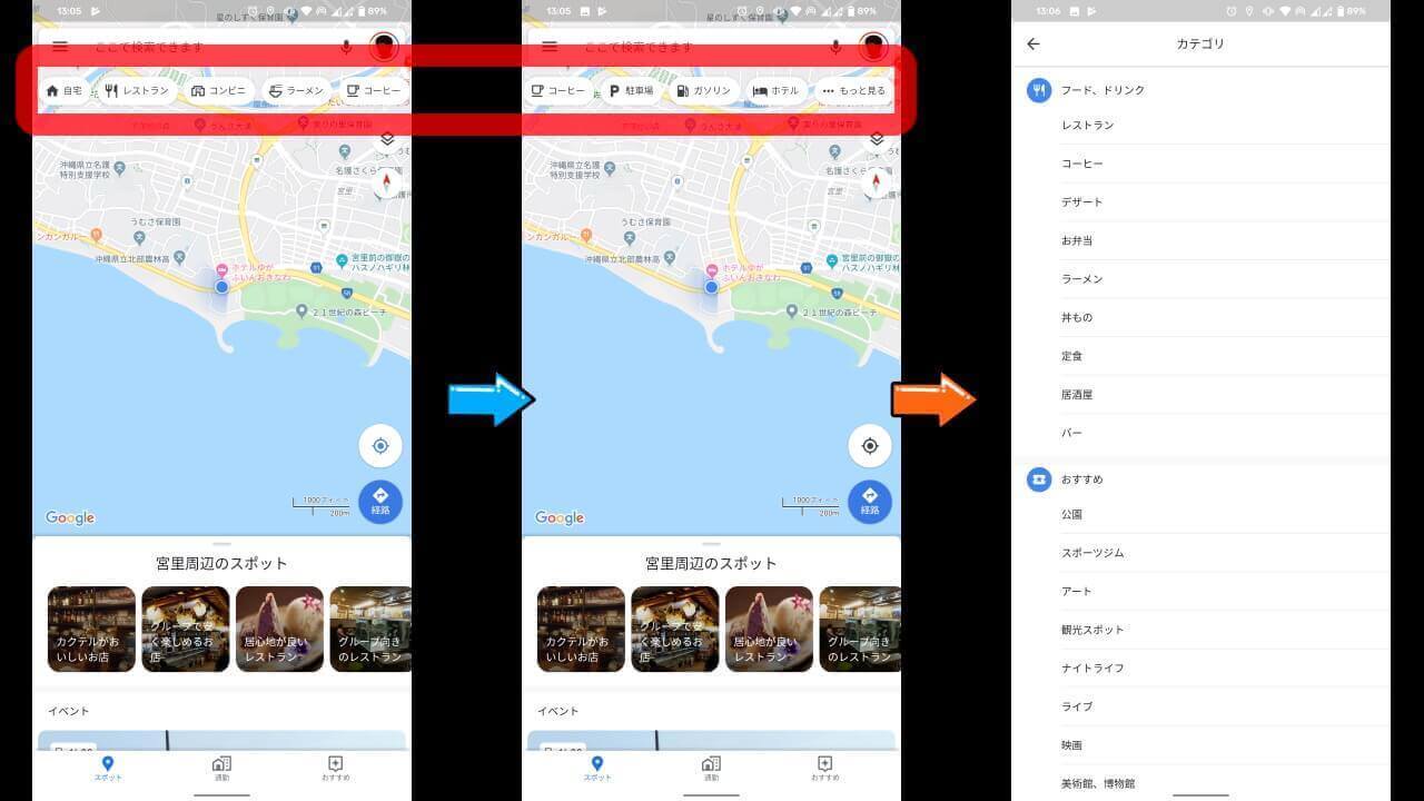 Android 版「Google マップ」アプリに新たに追加されたスポットカテゴリボタンは、[レストラン]や[コンビニ]、[ホテル]や[駐車場]など、目的のスポットをカテゴリから素早く探し出すことができる便利機能です。
