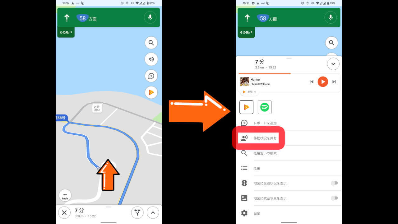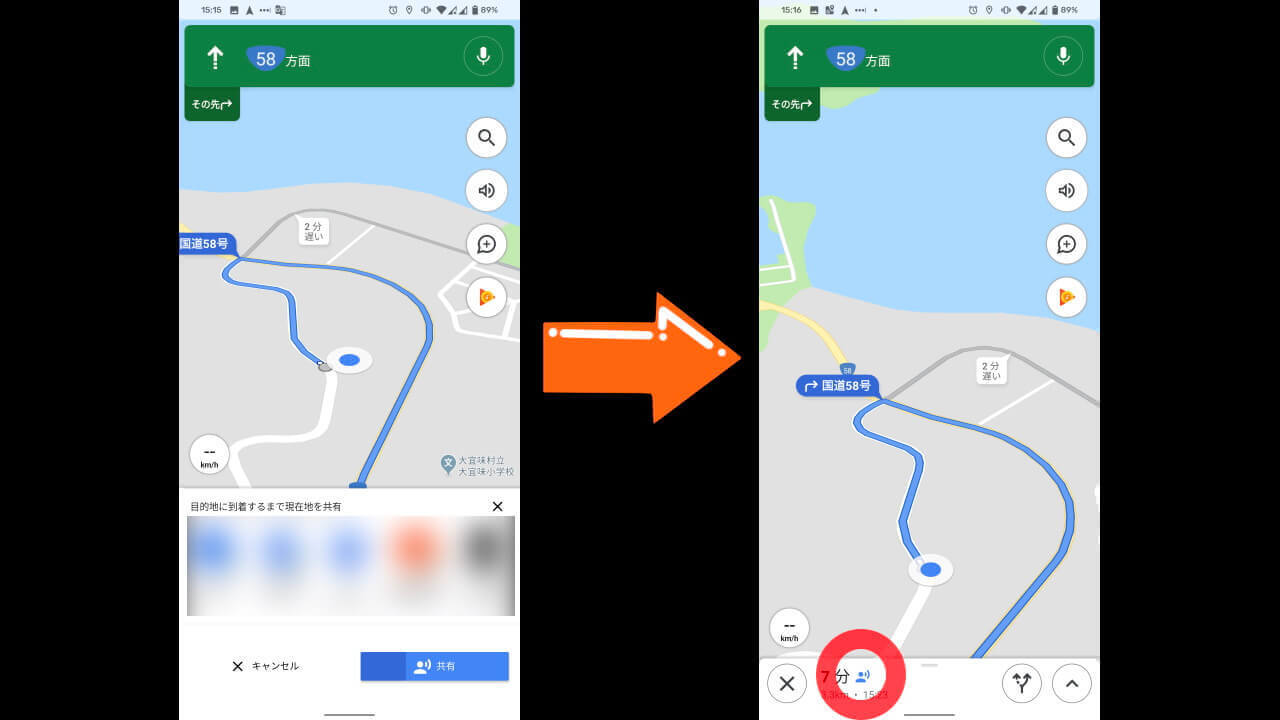 Android と iOS 版「Google マップ」アプリでは、ナビゲーション利用中に自身の位置情報を共有して相手に知らせることができる[移動状況を共有]機能が実装されています。