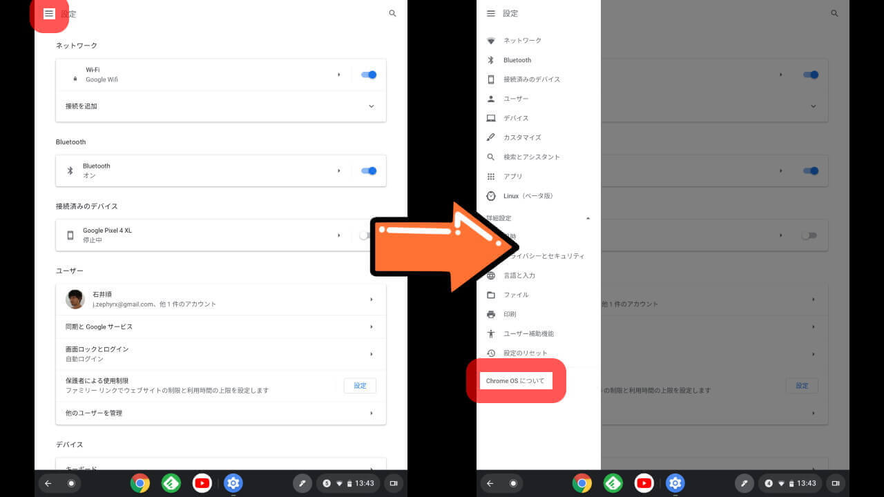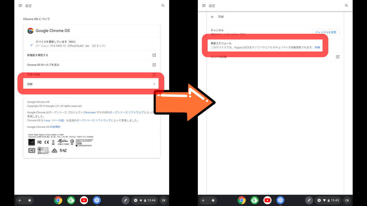 - 「Chromebook」本体で更新スケジュールを確認する方法をご紹介