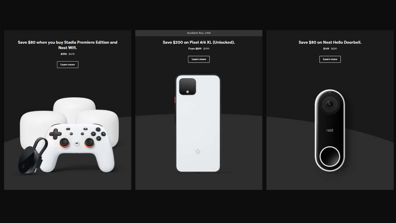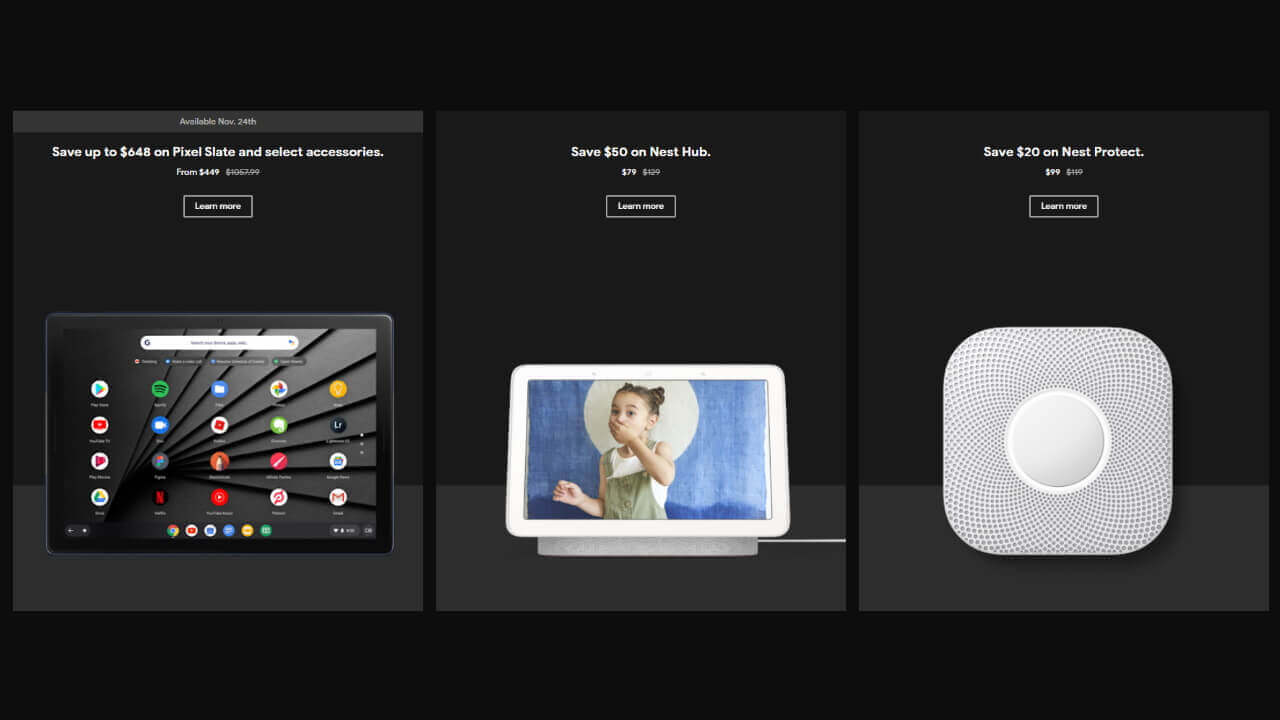 以下は一部抜粋です。ちなみに「Pixel 4」「Pixel 4 XL」の $200 引きセールや「Pixel Slate」のセールなどは、11 月 24 日から早期スタートする模様。