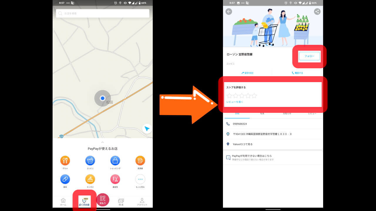 今回「PayPay」アプリの[近くのお店]タブに追加された新機能は、お店のフォロー機能とレビュー機能です。よく行く「PayPay」対応店舗をフォローしておくことで、最新情報やクーポンをいち早く入手することができるようになります。