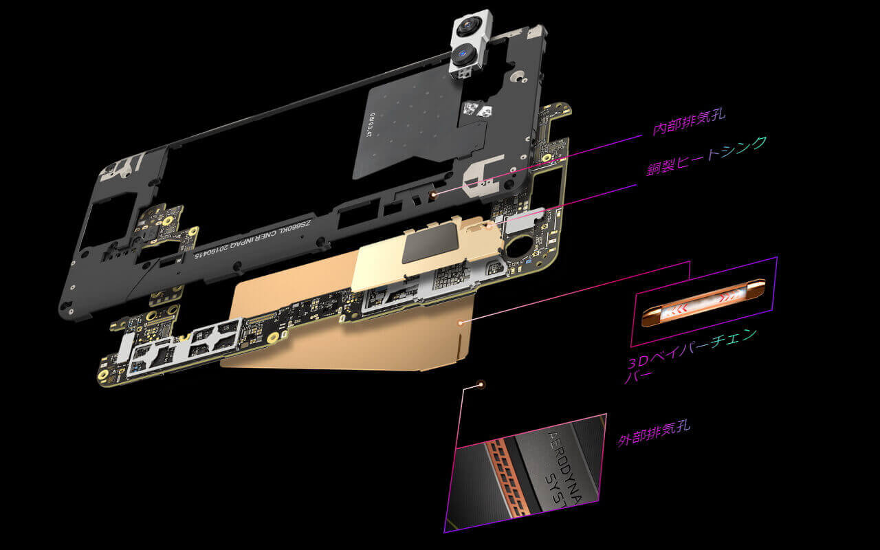 「ROG Phone II」は、2019 年夏に Qualcomm から発表された最新プロセッサ「Snapdragon 855+」を搭載する、当初としては初のスマートフォンです。更に 12GB RAM LPDDR4X、512GB / 1TB(UFS 3.0)容量の内部ストレージも搭載。発熱が考慮された冷却システムももちろん搭載です。
