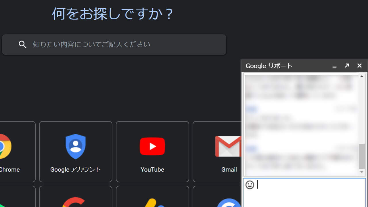 具体的には、Google サポートページ(https://support.google.com/)にアクセスすることで、Google サポートとの[チャット]ウィンドウが自動で開き、そのまま[チャット]を継続して行なうことができるようになります。