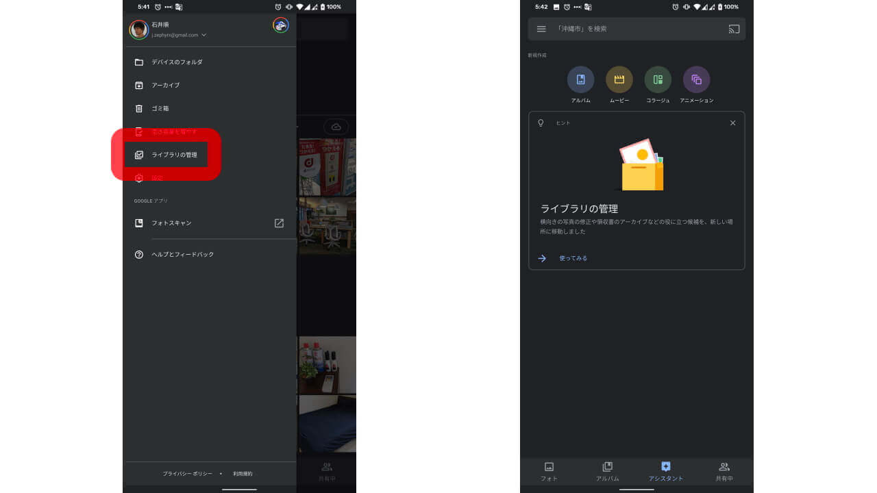 ということで、今回そこまで大きな UI 変更というわけではありませんが、「Google フォト」にて、これまで[アシスタント]のみにまとめられていた候補写真が、今後はライブラリ整理用の[ライブラリの管理]と[クリエイティブ]候補用の[アシスタント]に分けられます。