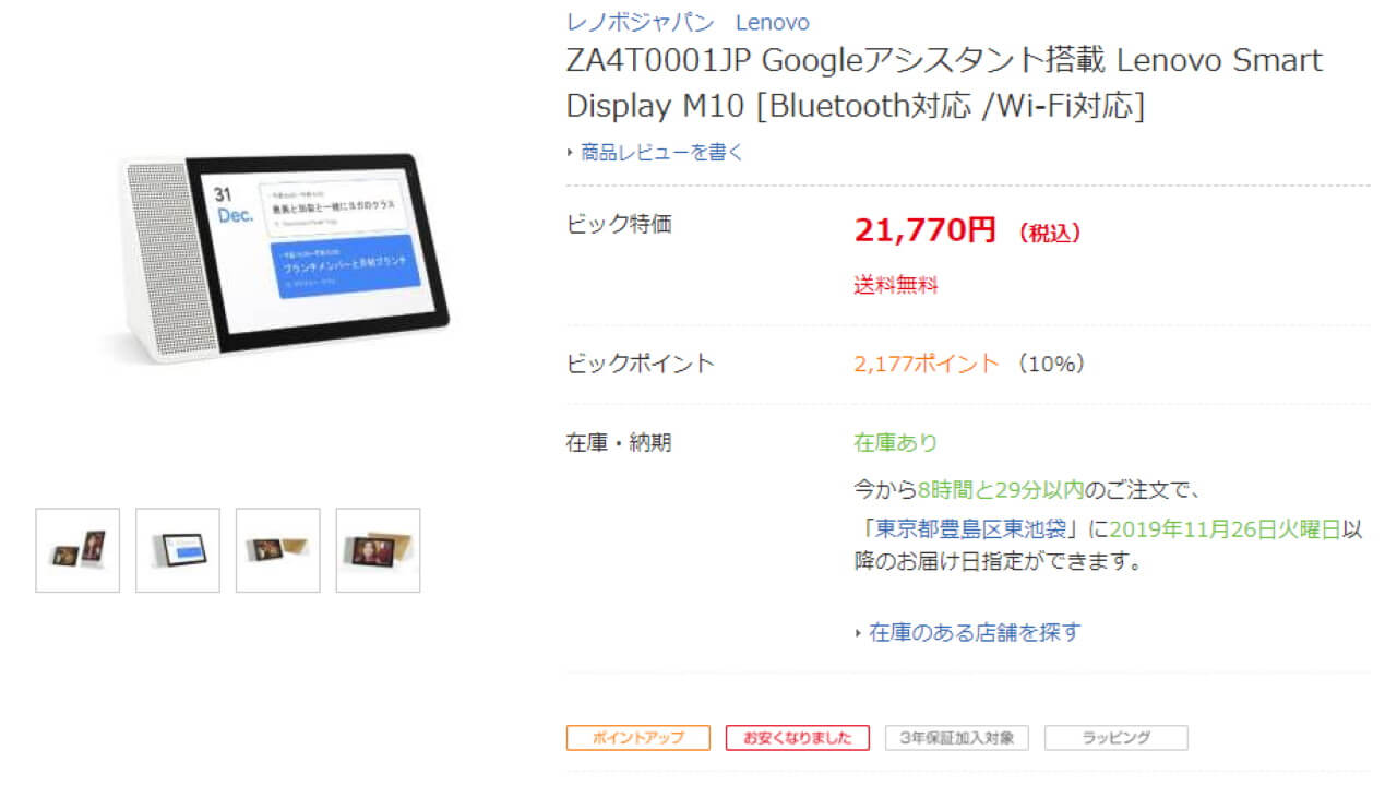 さらに今回の「Lenovo Smart Clock」と「Lenovo Smart Display M10」の値下げは、国内大手家電量販店ビックカメラでも行われています。しかもビックカメラでは更に 10% ポイント還元付き。