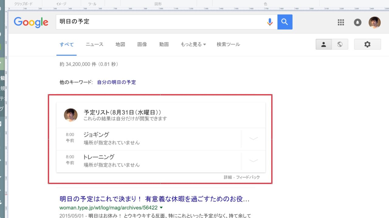 この “プライベート検索結果” では例えば、“明日の予定” というキーワードで検索を行うと “明日の予定” に関連したウェブサイト一覧の検索結果の上に、「Google カレンダー」から抽出したユーザーの “明日の予定” も表示してくれるなど、検索がパーソナライズされるわけです。