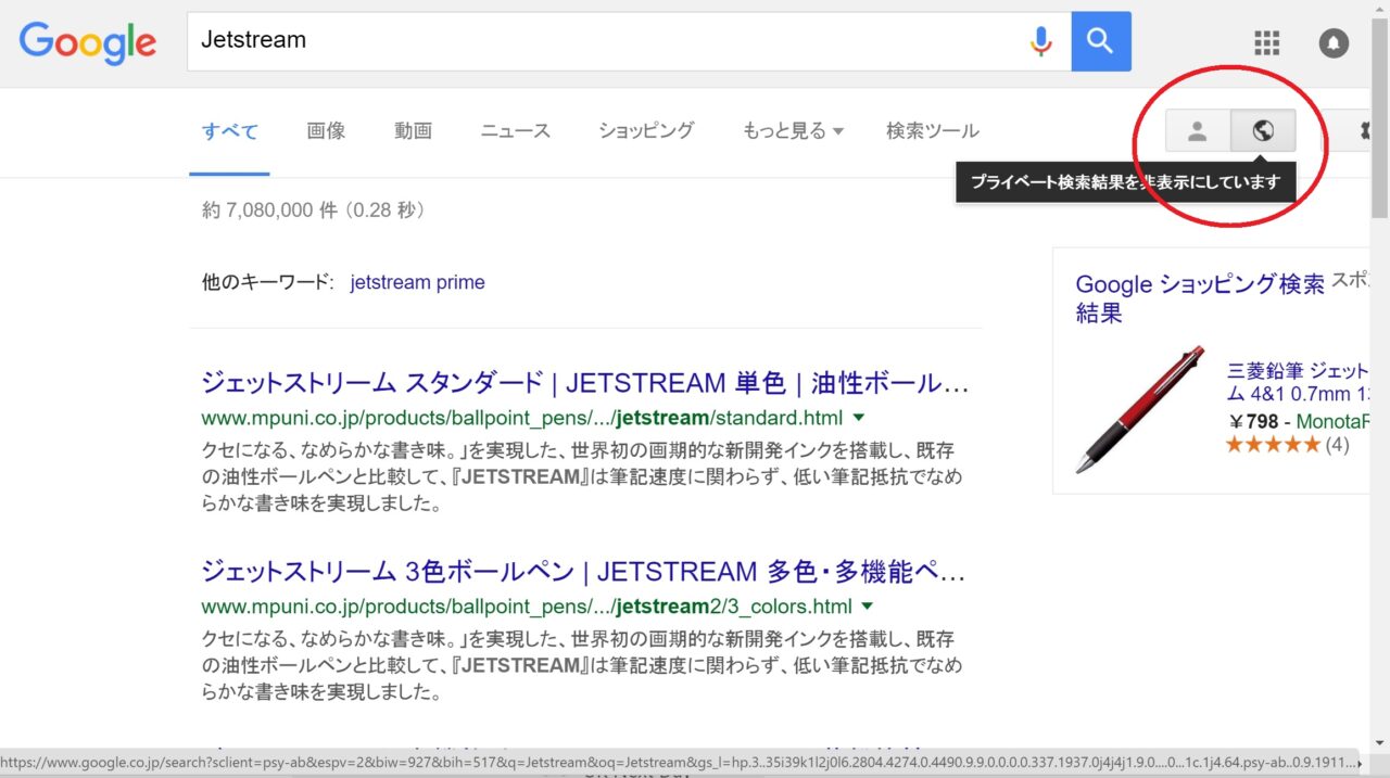 実はいちいち設定を行わなくても、一時的にですが “プライベート検索結果” を オフ にした検索を行うことができます。
