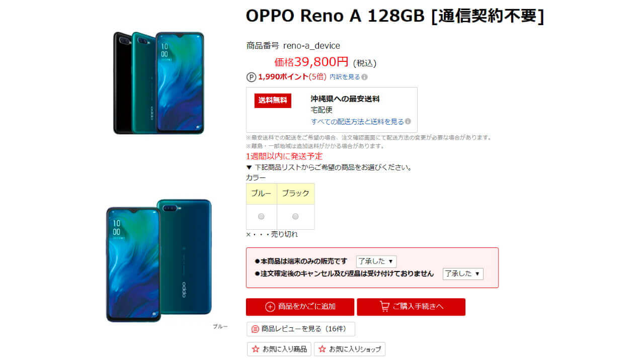 楽天市場に「OPPO Reno A 128GB」がやっと再入荷