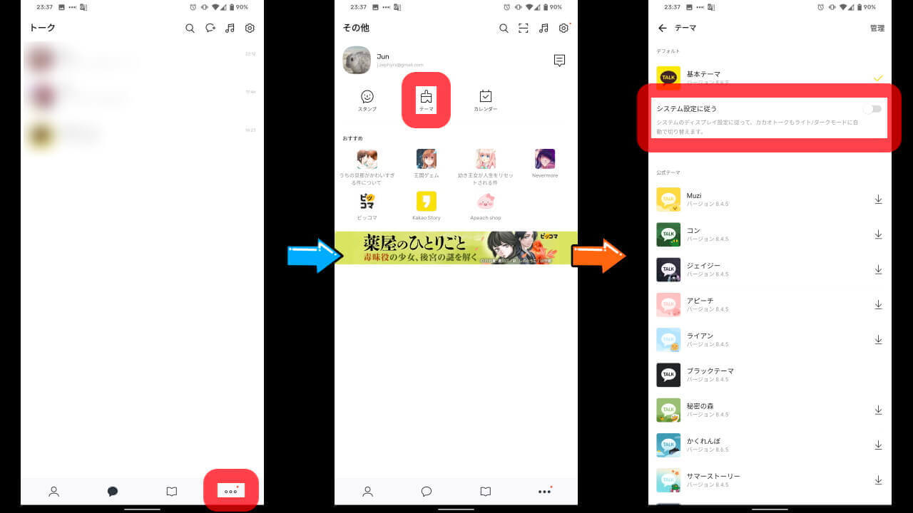 「カカオトーク」アプリはこれまで、[テーマ]設定から[ブラックテーマ]をインストールして適用すれば擬似的なダークモードとなっていたのですが、今回はアプリ内設定からダークモードに切り替えることができるようになっています。