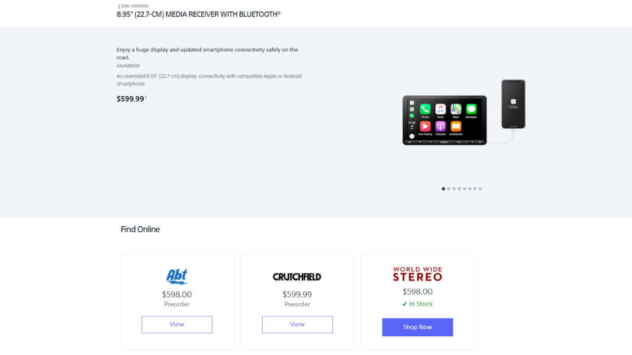今回 Sony 公式に「XAV-AX8000」の販売が開始されたわけですが、Sony 公式サイトでの販売開始ではなく、現地通販サイトの “World Wide Stereo” のリンクが設置されている状態です。価格は $598.00。