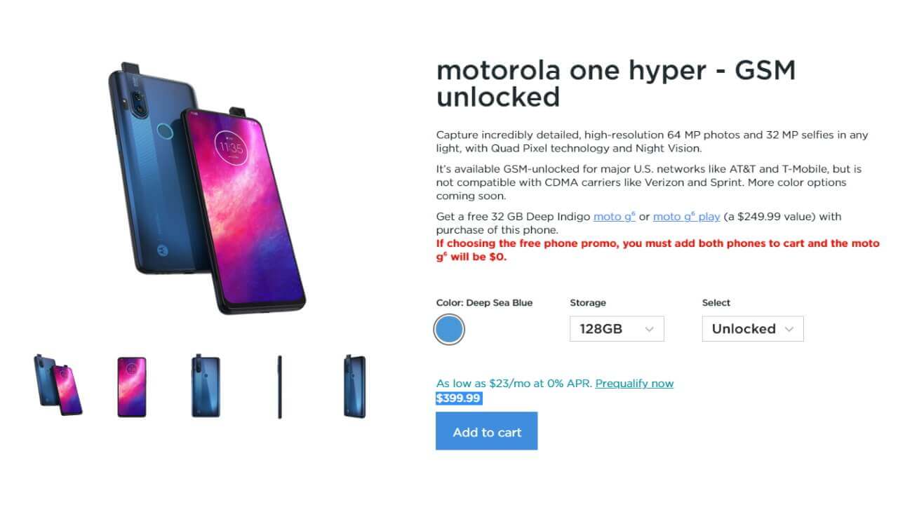 「Motorola One Hyper」は同日より、米国の Motorola 公式サイトで発売されています。しかも「Moto G6」もしくは「Moto G6 Play」を同時購入すると、「Moto G6」もしくは「Moto G6 Play」が無料となる特典付き。