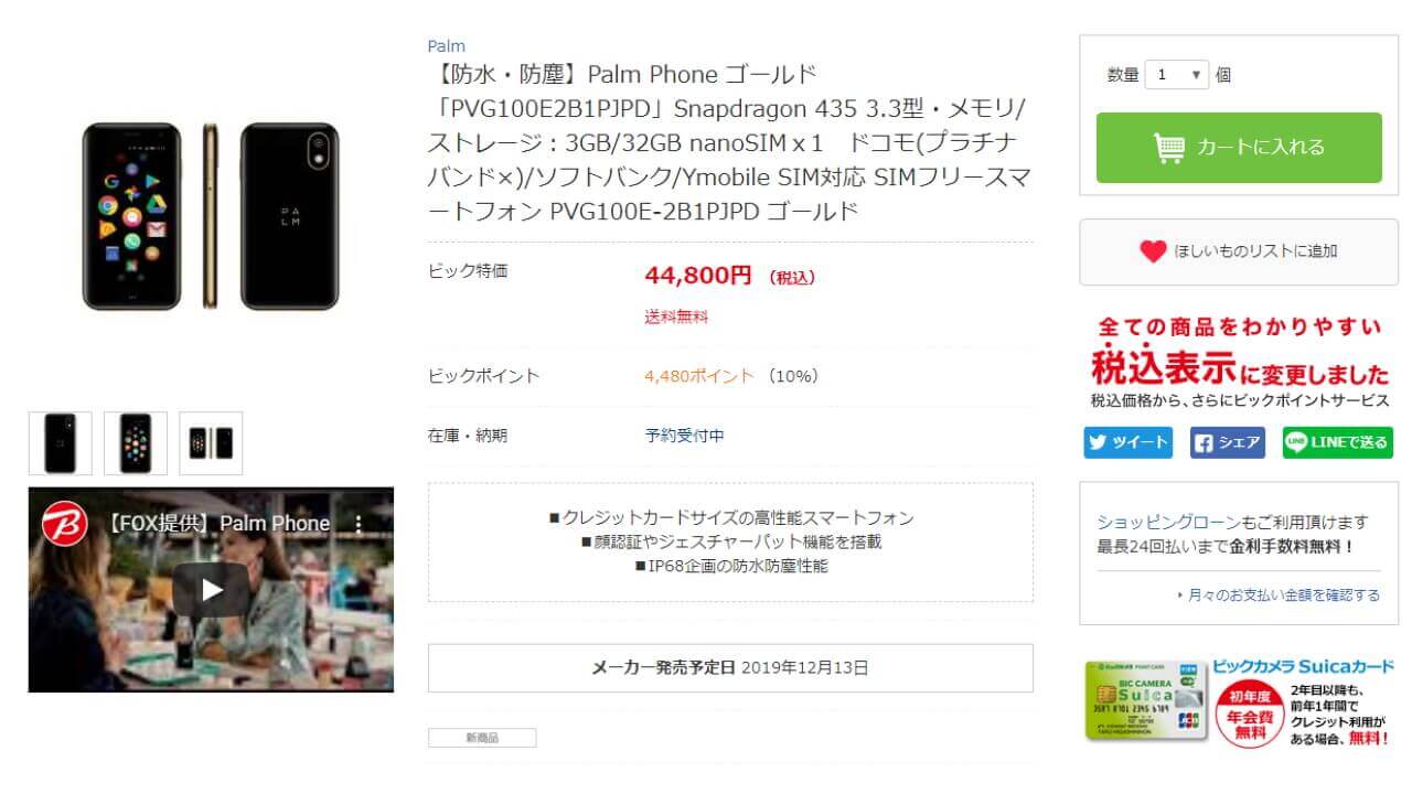 「Palm Phone」“Gold” は 12 月 13 日発売予定です。ビックカメラ価格は 44,800 円。