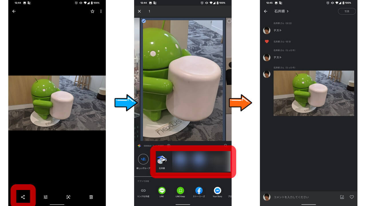 「Google フォト」の新しいチャット機能は、写真を表示して共有アイコンをタッチし、メールアドレス宛に共有を行うことで開始されます。また Google ユーザーだけでなく、ほかのドメインともチャットを行うことが可能。コメント投稿も可能です。