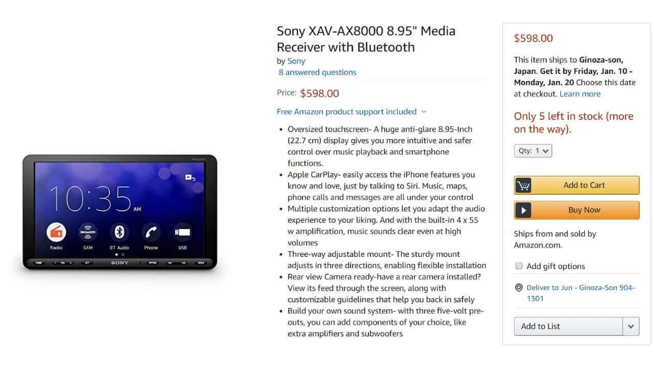 というのも、「XAV-AX8000」は以前よりマーケットプレイス “Bass 5441” が直輸入可能で出品していたのですが、今回は Amazon による公式の出品となります。本体価格は $598.00 です。