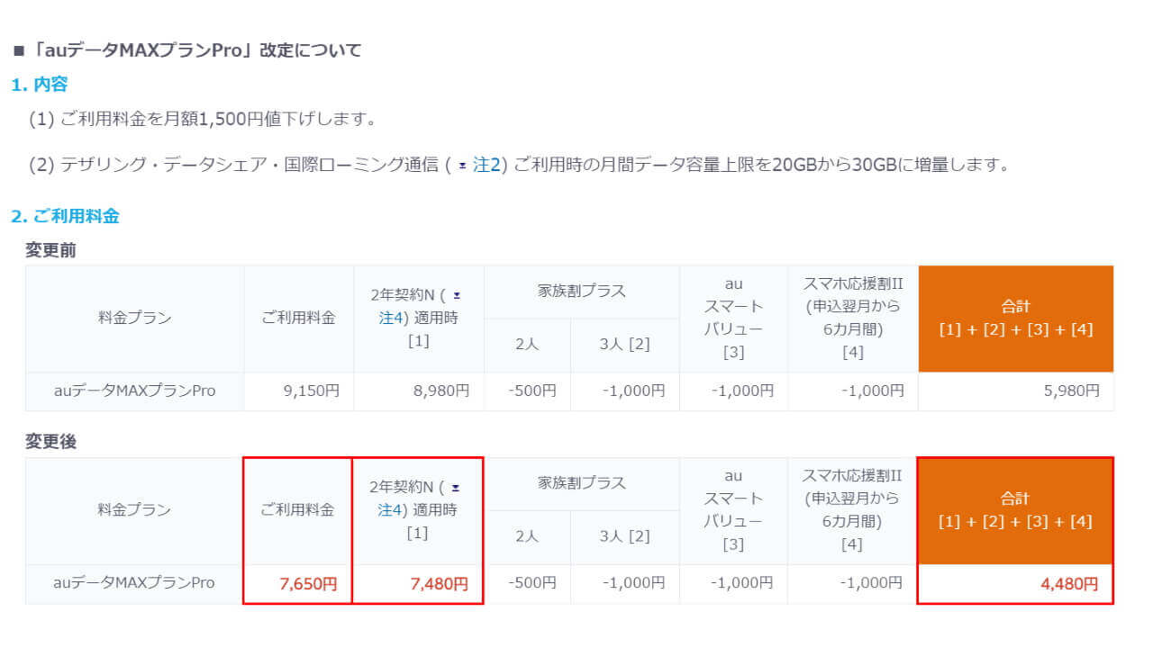 KDDI は 2020 年 1 月 17 日、2019 年 7 月から提供しているデータ容量無制限「auデータMAXプラン」改めて「au データ MAX プラン Pro」を、2 月より 1,500 円値下げすると発表しました。