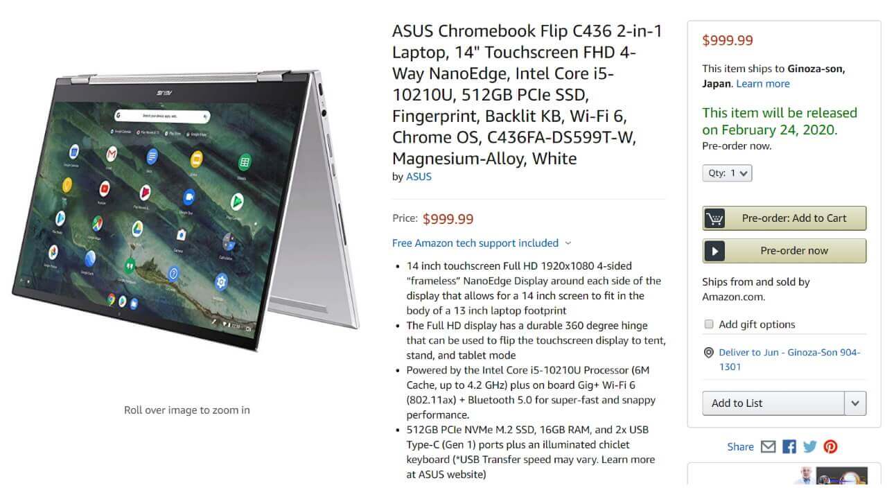 ASUS が 2019 年 1 月 6 日に CES 2020 にて発表した、360 度回転するフリップ型 Chromebook の新型「Chromebook Flip C436」が、米国の Amazon.com で予約開始となりました。