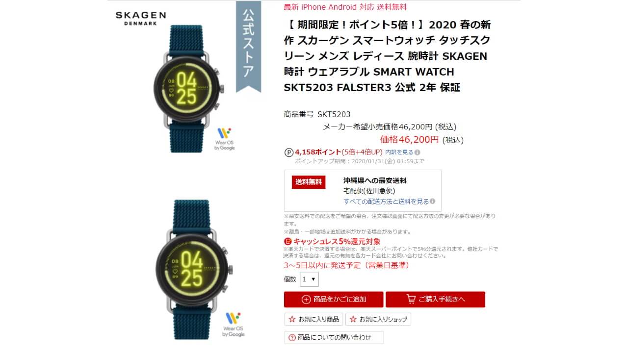 「SKAGEN FALSTER 3」の SKAGEN 公式楽天市場ストア価格は、送料と消費税込みで 46,300 円です。さらに今ならポイント 5 倍。ポイント 5 倍は 1 月 31 日までです。