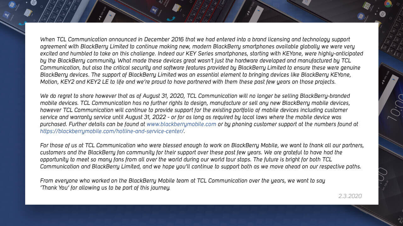 BlackBerry は 2020 年 2 月 3 日、既存スマートフォンの販売を 2020 年 8 月 31 日をもって終了すると発表しました。