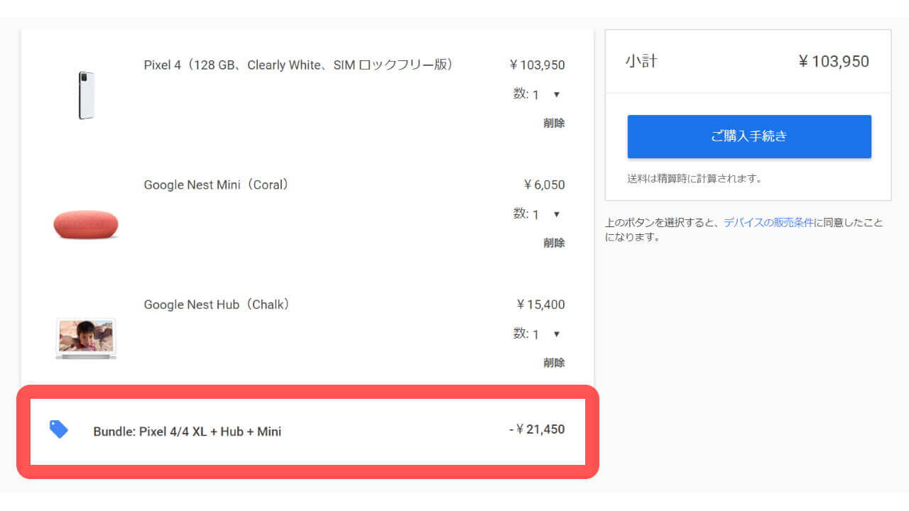 「バレンタイン特別セール」期間中、「Pixel 4」か「Pixel 4 XL」と「Nest Hub」「Nest Mini」をそれぞれショッピングカートに入れて精算を行うだけで、「Nest Hub」と「Nest Mini」が無料になります。合わせて 21,450 円もお得です。