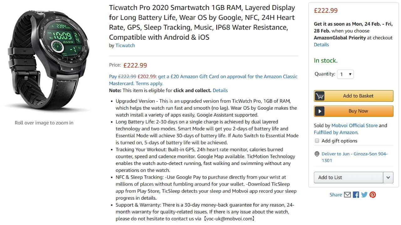 「Ticwatch Pro 2020」の本体価格は VAT 込 £222.99 で、英国の Amazon.co.uk などから購入することができます。