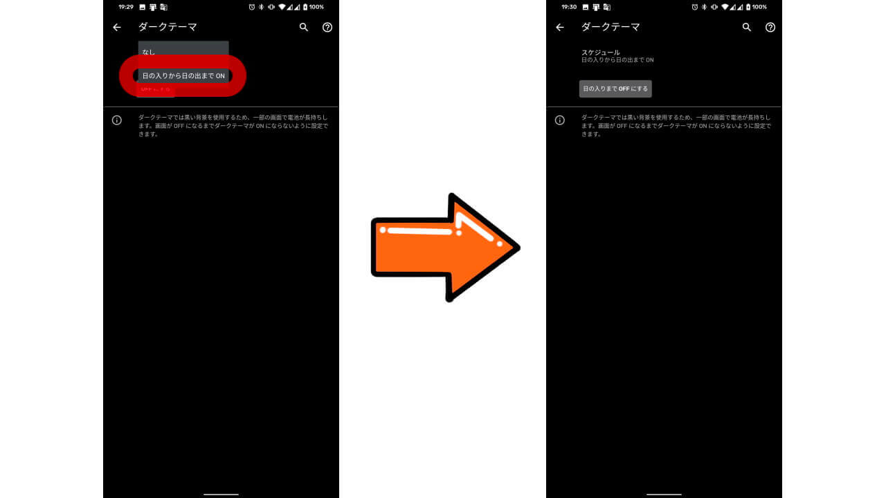 「ダークテーマ」のスケジュールは日の入りから日の出までの間、自動で「ダークテーマ」が適用されるオート機能です。昼間は「ライトモード」で明るく見やすく、暗くなったら「ダークテーマ」を自動適用して目に優しく、テーマを自動切り替えすることができます。