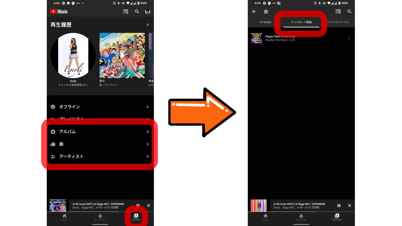 「YouTube Music」にアップロードした楽曲ファイルは[ライブラリ]タブに格納されるのですが、さらに[アルバム][曲][アーティスト]のいずれかのタブを選択して、さらに[アップロード動画]に切り替えないと表示されないという、若干ややこしい仕様です。