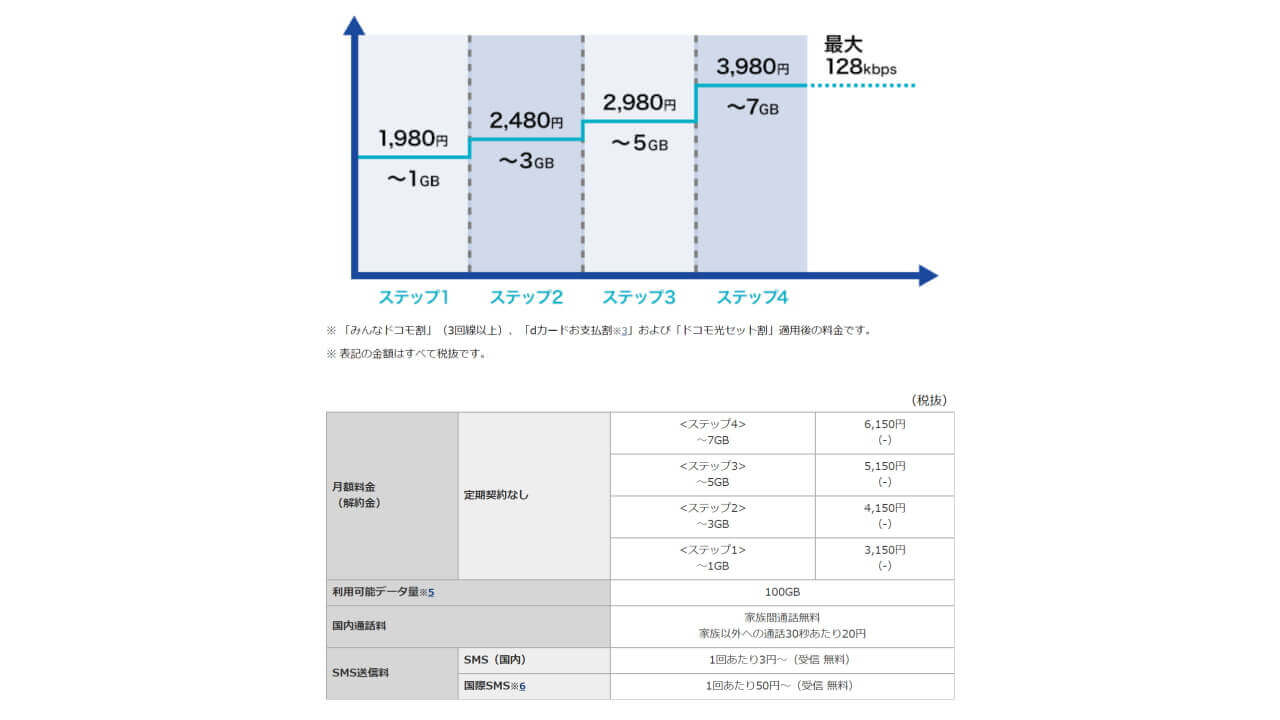 料金は順に、3,150 / 4,150 / 5,150 / 6,150 円(税抜き)となります。7GB を超過した場合、下り最大速度 128kbps での低速通信が可能。