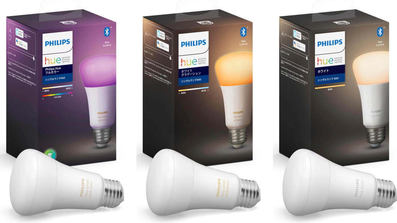 新たに国内発売された「Philips Hue Bluetooth + Zigbee」は、「Hue フルカラー シングルランプ」「Hue ホワイトグラデーション シングルランプ」「Hue ホワイト シングルランプ」の 3 種類です。
